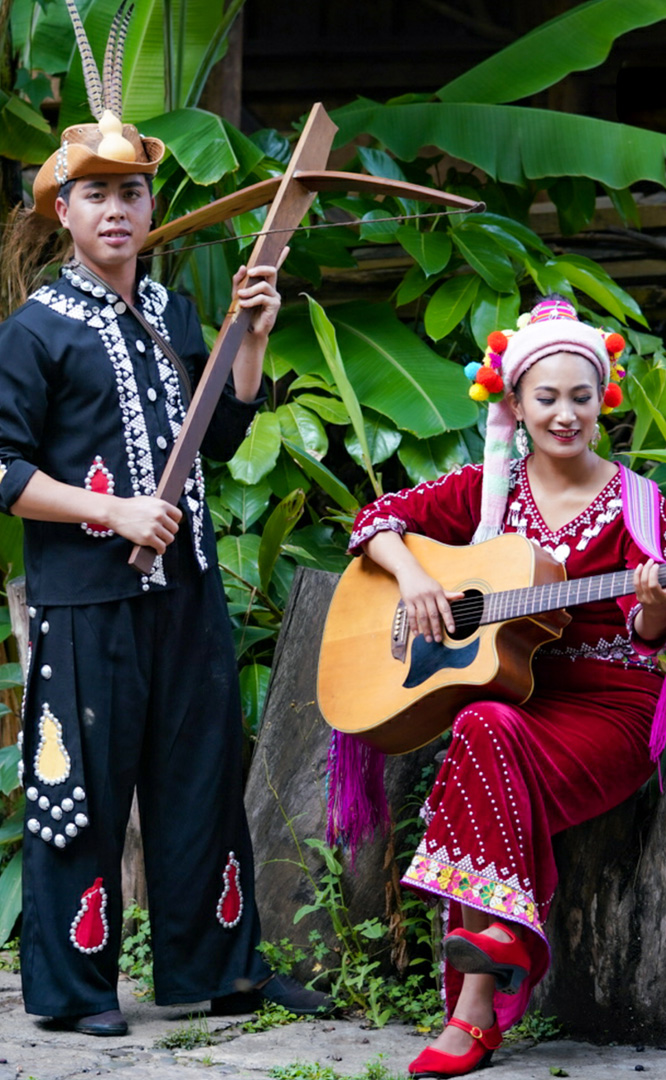德昂族人口約1.7萬,主要分布在德宏州和保山市的潞西、梁河、瑞麗、隴川、隆陽等縣區(qū)。民居多為草排覆頂竹木結構的干欄式建筑,眼前的德昂村建筑納入了能容納數十人居住的德昂大房子,氈帽頂的小房子,還有頗具浪漫色彩的大公房、小公房……還建有“龍陽塔”標志及佛教奘房、佛塔。德昂族民間普遍信奉南傳佛教,民俗活動與佛事活動關聯緊密。潑水節(jié)、開門節(jié)、關門節(jié)是重大節(jié)日。德昂族服飾色彩豐富,口頭文學特別是民歌創(chuàng)作活動...